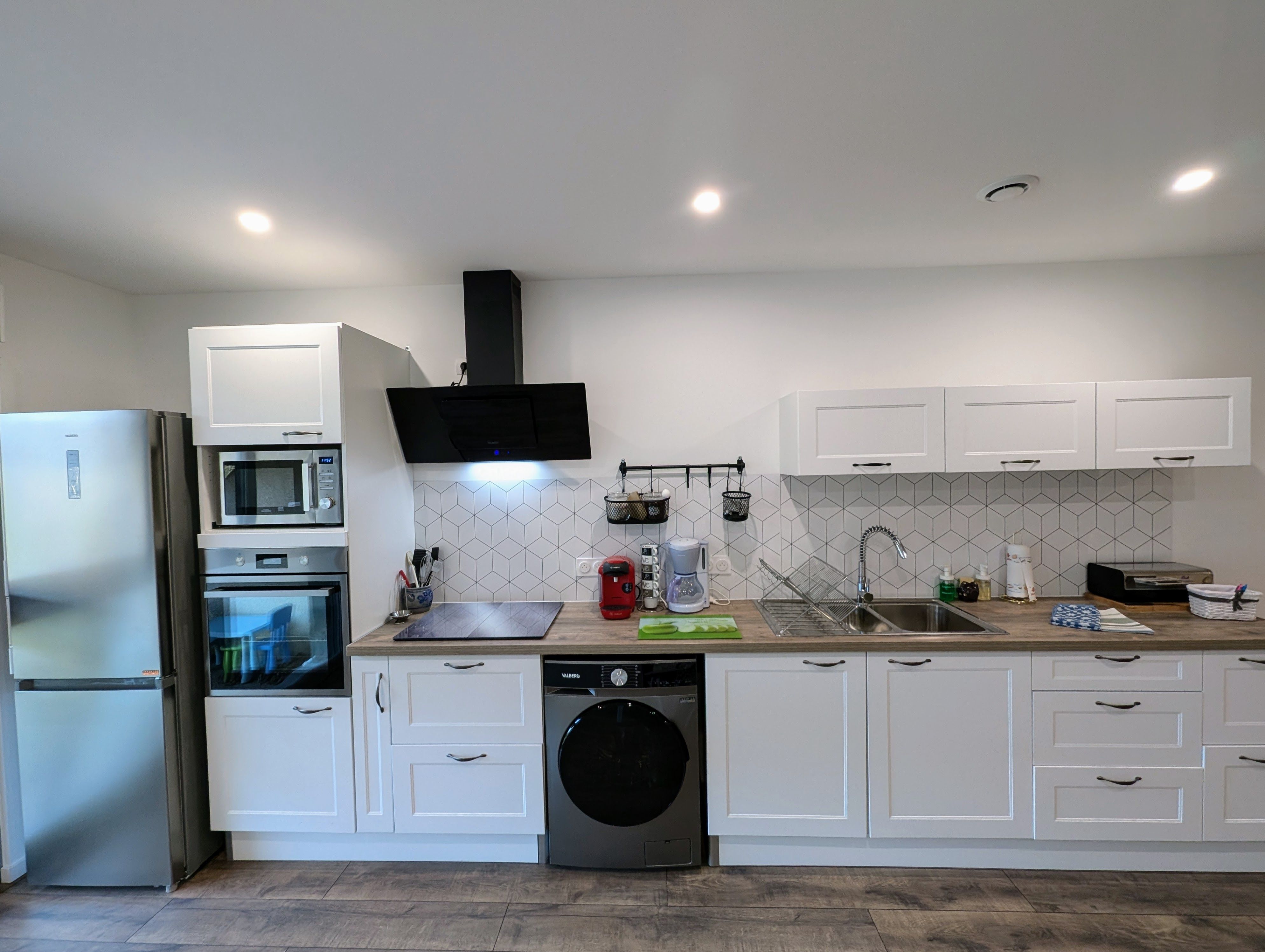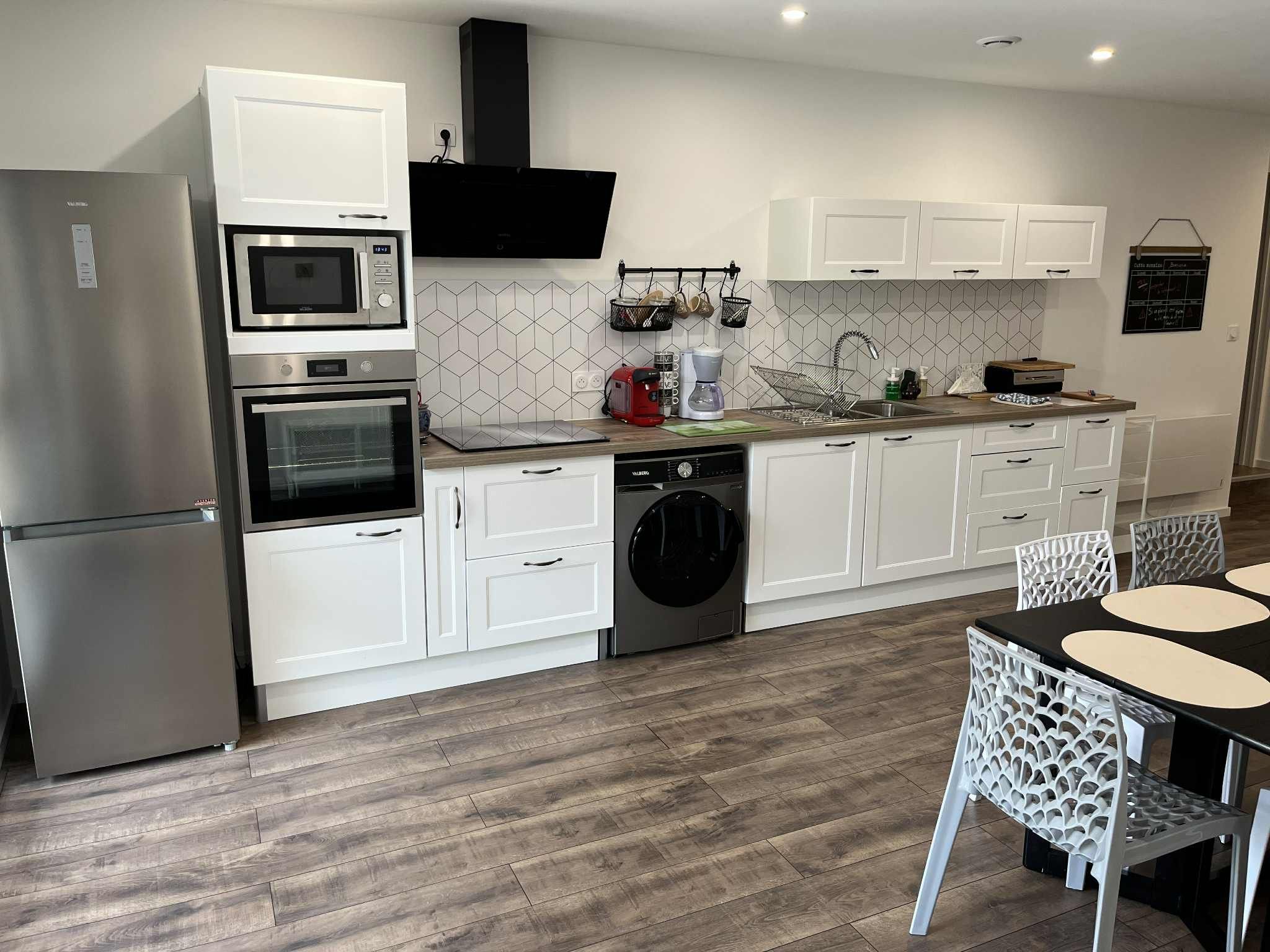 Plaques à induction, hotte aspirante, four et micro-ondes, réfrigérateur grande capacité, bouilloire, grille-pain, 1 cafetière filtre et 1 à dosette, presse-agrumes, ustensiles de cuisine variés, ainsi que de nombreux rangements (pas de lave vaisselle).