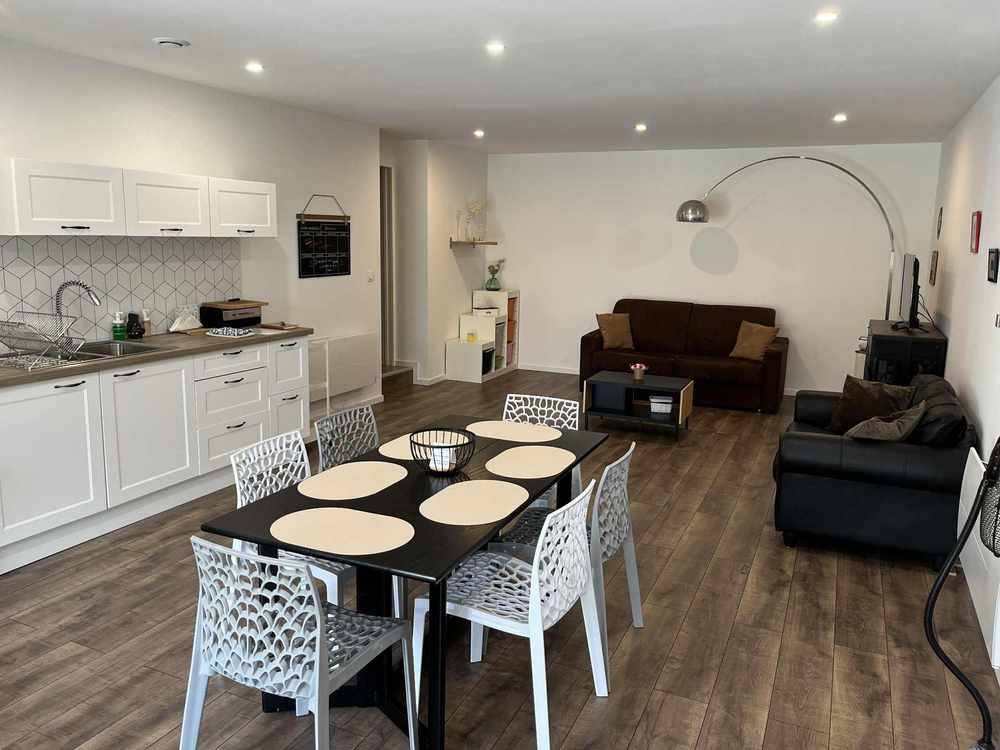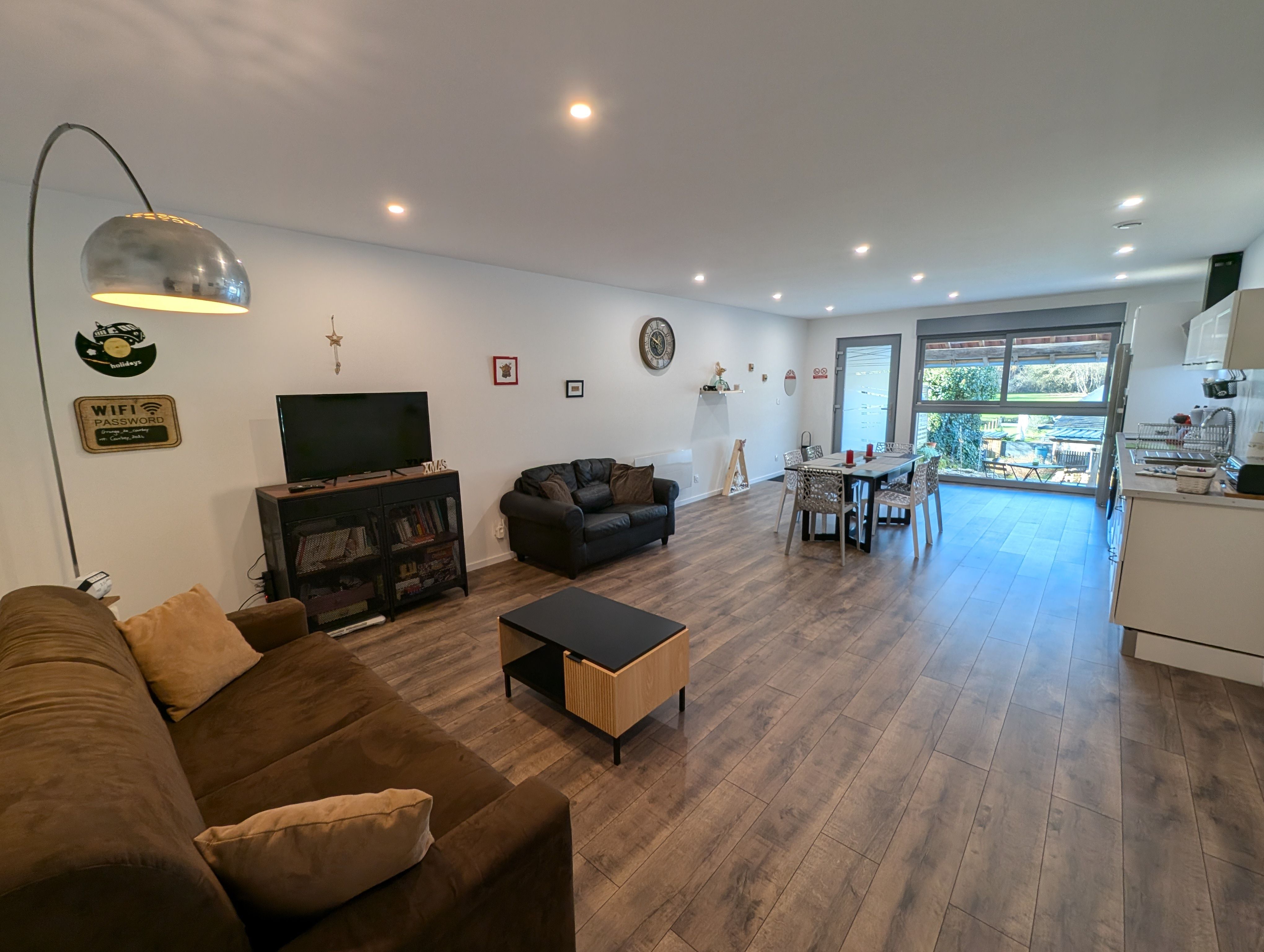 Le grand séjour/salon spacieux et lumineux s’ouvre sur une cuisine moderne entièrement équipée. Vous y trouverez :