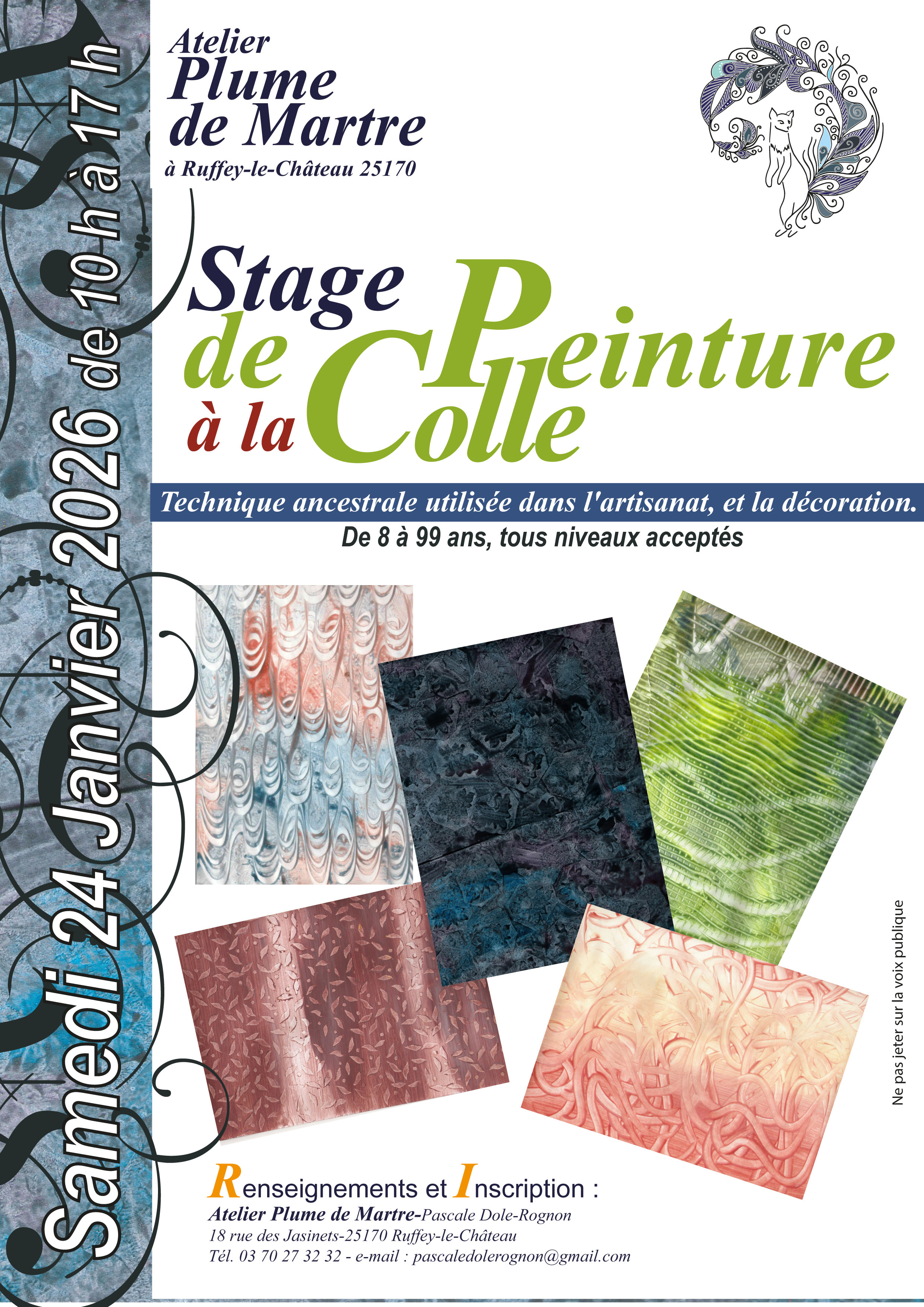 Ce stage de "Peinture à la Colle" vous présentera en détails cette technique ancestrale, joyeusement magique, fabriquée avec de l’amidon, offrant des textures en relief, des effets graphiques inattendus et souvent un petit “ooh” de satisfaction. Accessible à tous, "pas besoin de savoir dessiner", ludique, idéale pour lâcher prise et accepter l’imprévu, parfaite pour les enfants et pour les adultes.
